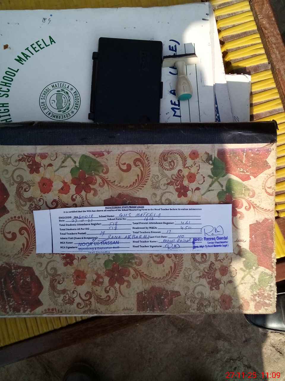 | Attendance Register | Head Teacher | MEA with School | Visit Proof |