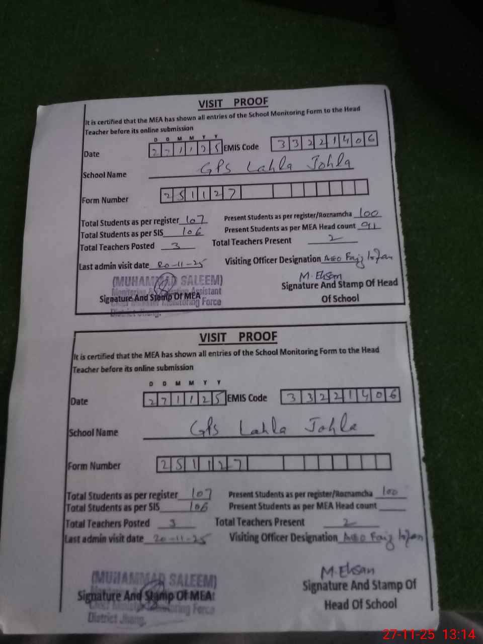 | EMIS Code: 33221406 | Name of School: GPS LAHLA JOHLA (April-2016) | |||