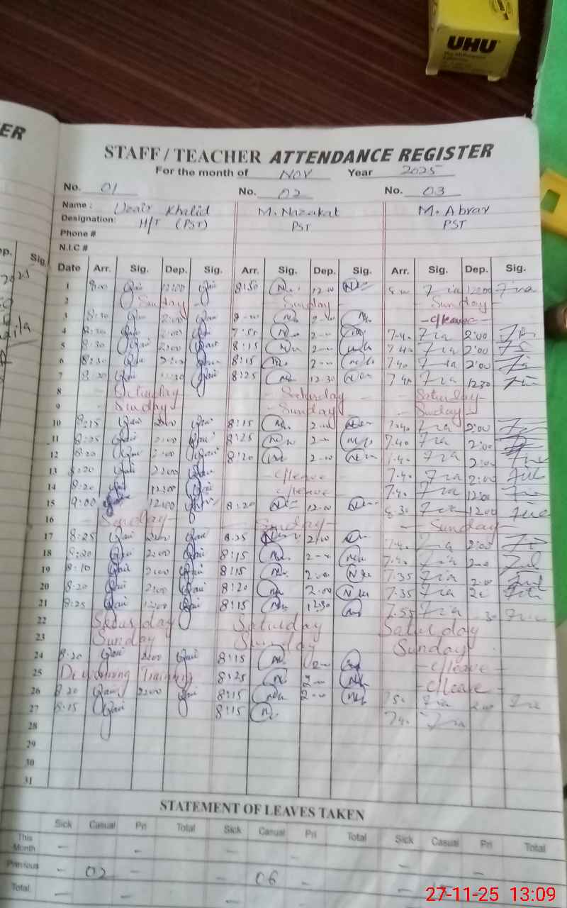 | CNIC | Full Name | Designation | R/C | Absence During Last Calender Month |