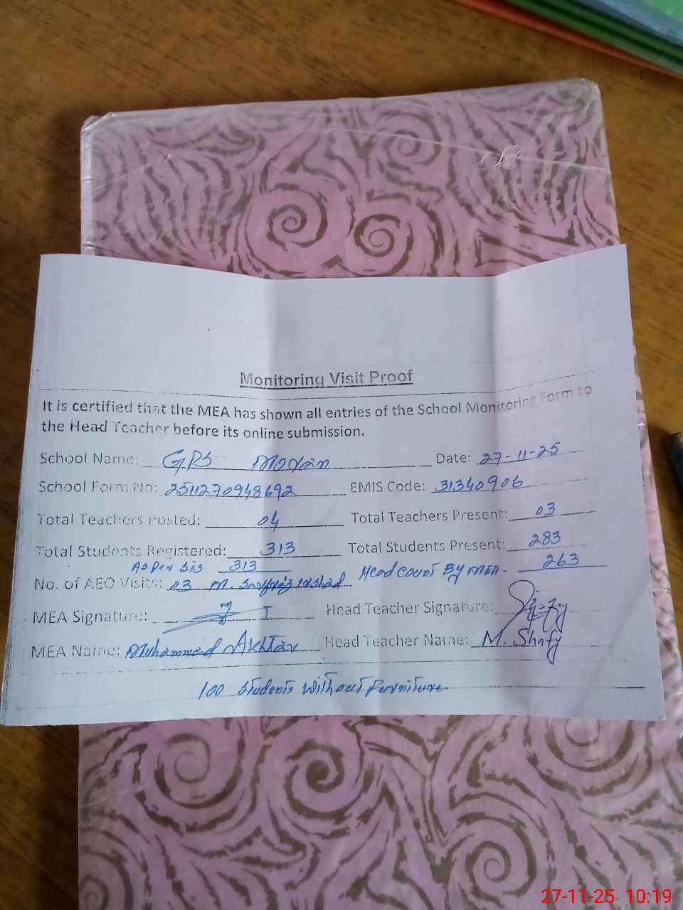 | Attendance Register | Head Teacher | MEA with School | Visit Proof |