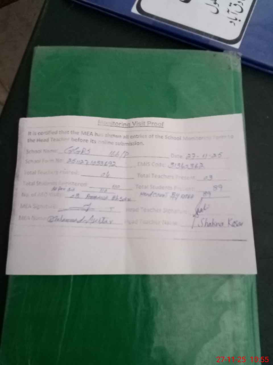| Attendance Register | Head Teacher | MEA with School | Visit Proof |