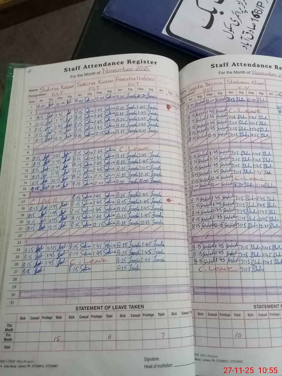 | Leave | Duty | Absent | Maternity | Medical | Ex- Pak |