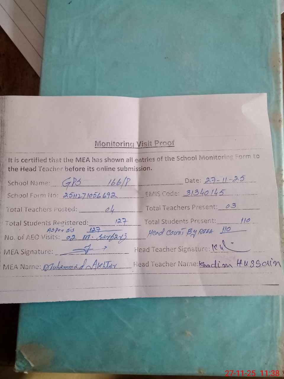 | Attendance Register | Head Teacher | MEA with School | Visit Proof |