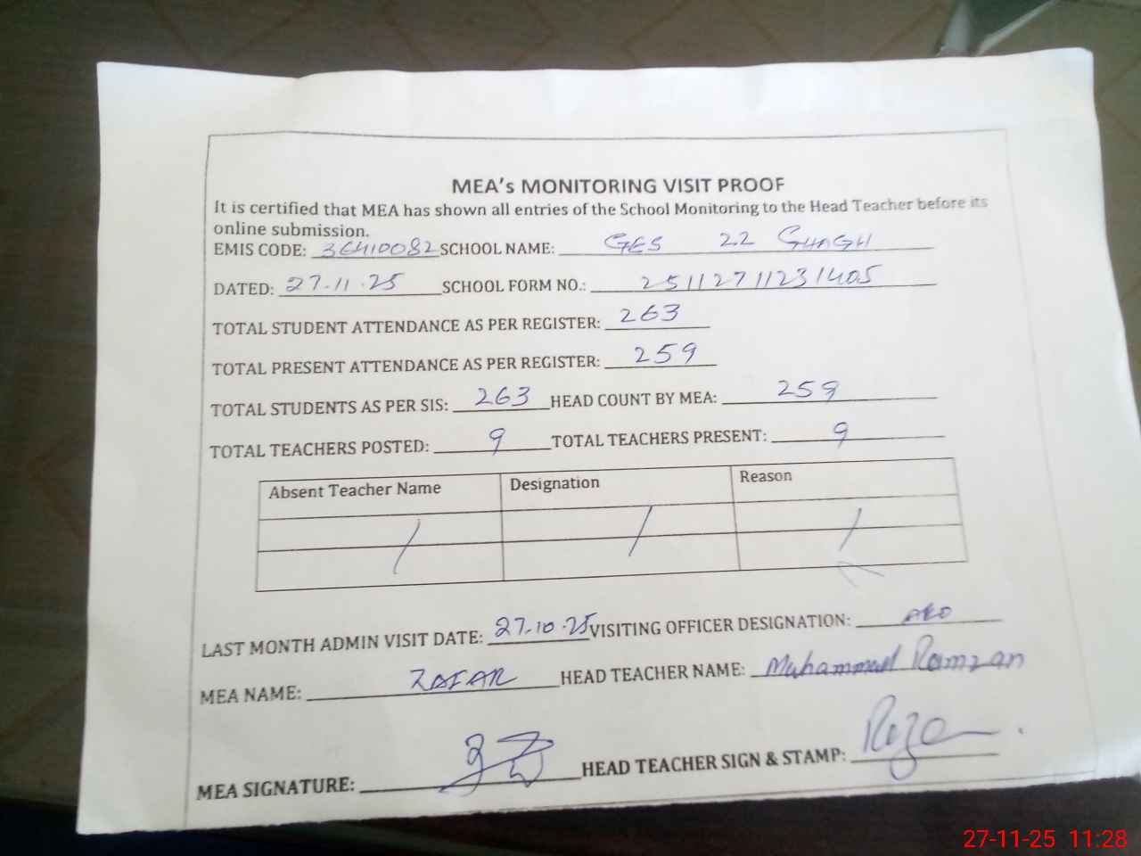 | Attendance Register | Head Teacher | MEA with School | Visit Proof |