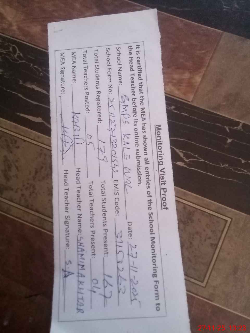 | Attendance Register | Head Teacher | MEA with School | Visit Proof |
