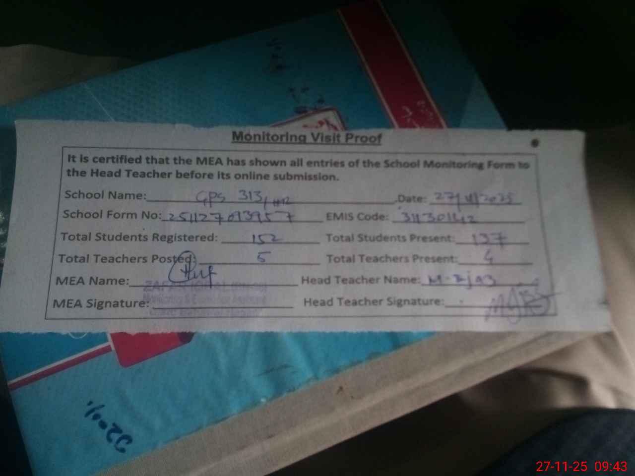 | Attendance Register | Head Teacher | MEA with School | Visit Proof |