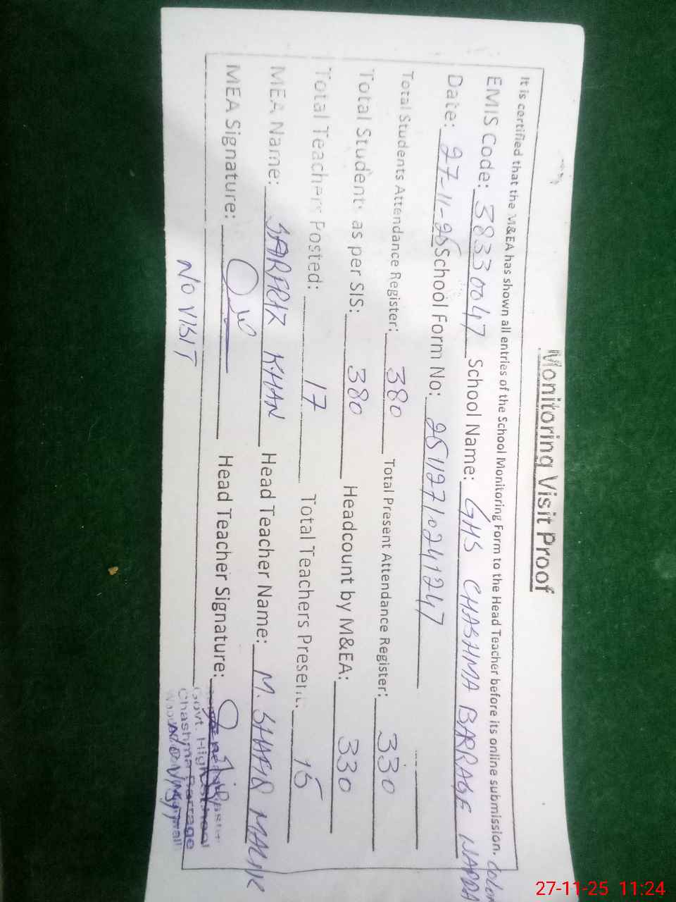 | Attendance Register | Head Teacher | MEA with School | Visit Proof |