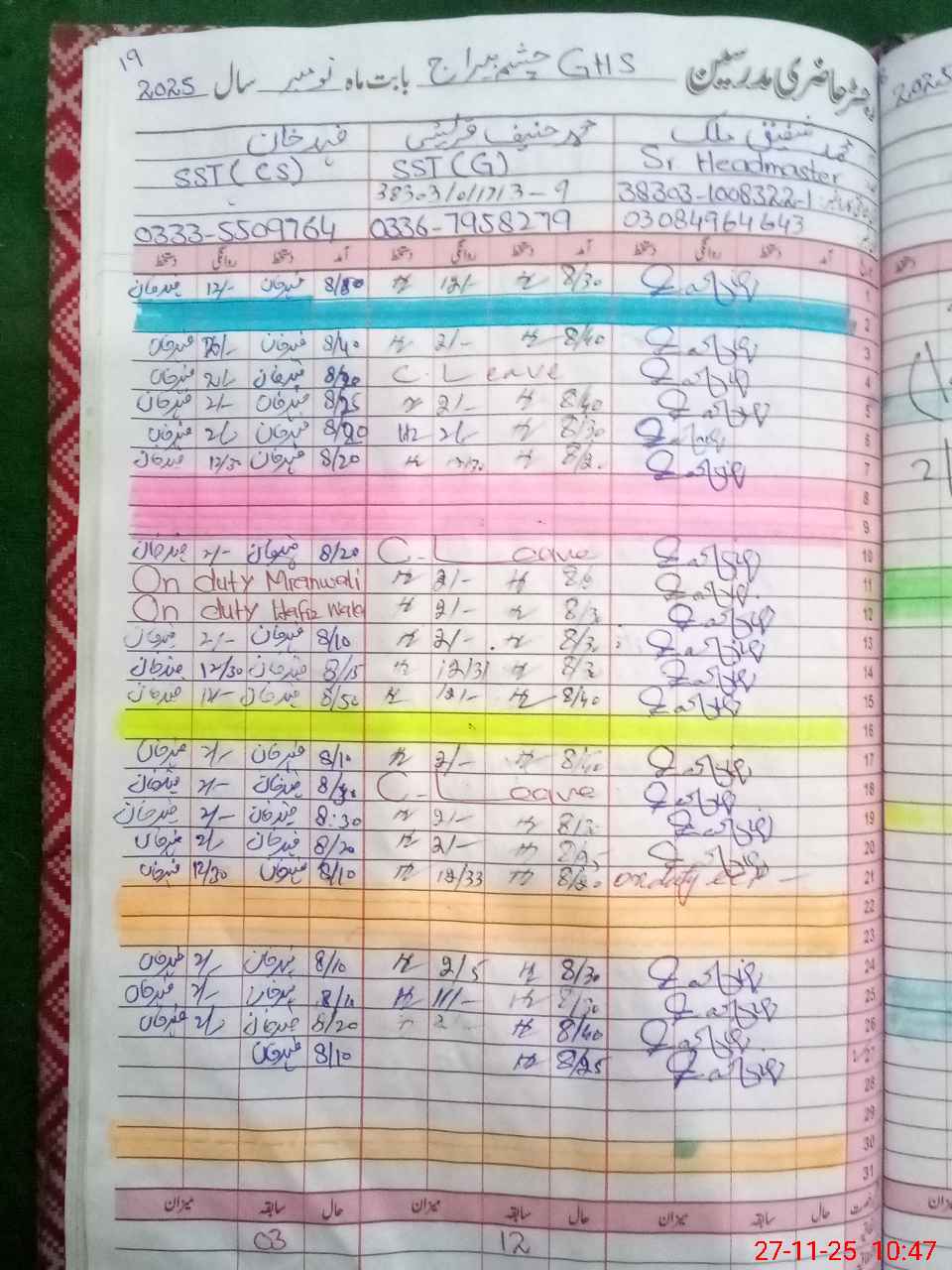 | CNIC | Full Name | Designation | R/C | Absence During Last Calender Month |