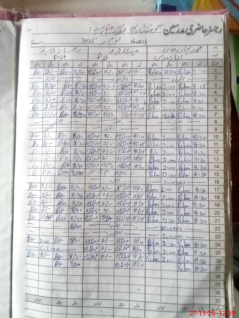 | CNIC | Full Name | Designation | R/C | Absence During Last Calender Month |