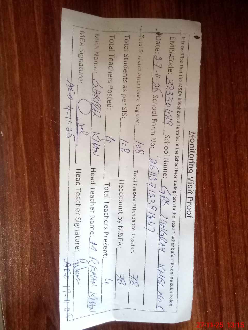 | Attendance Register | Head Teacher | MEA with School | Visit Proof |