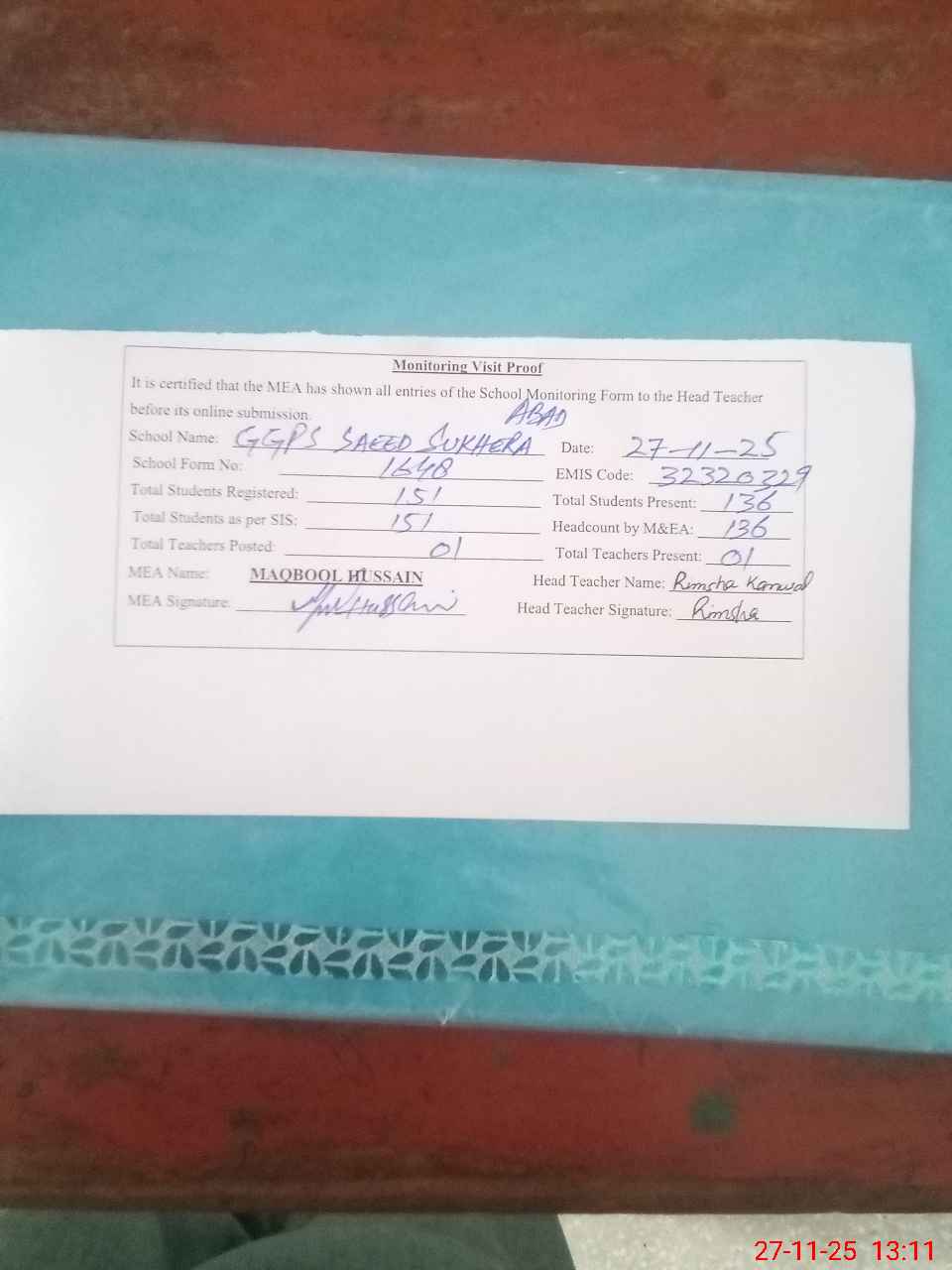 | Attendance Register | Head Teacher | MEA with School | Visit Proof |