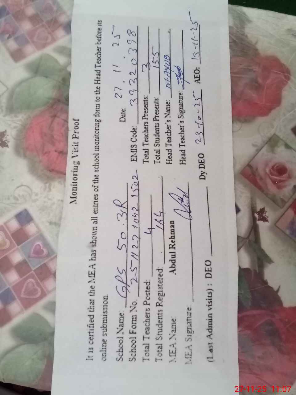 | Attendance Register | Head Teacher | MEA with School | Visit Proof |