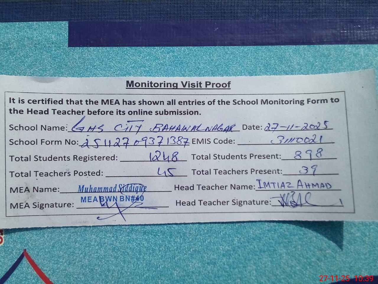 | Attendance Register | Head Teacher | MEA with School | Visit Proof |