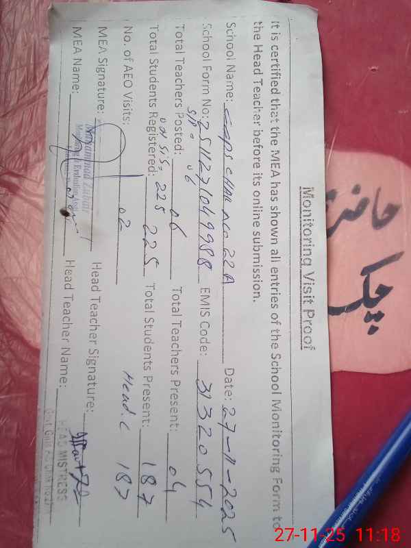 | EMIS Code: 31320554 | Name of School: GGPS CHAK NO 22/A | |||