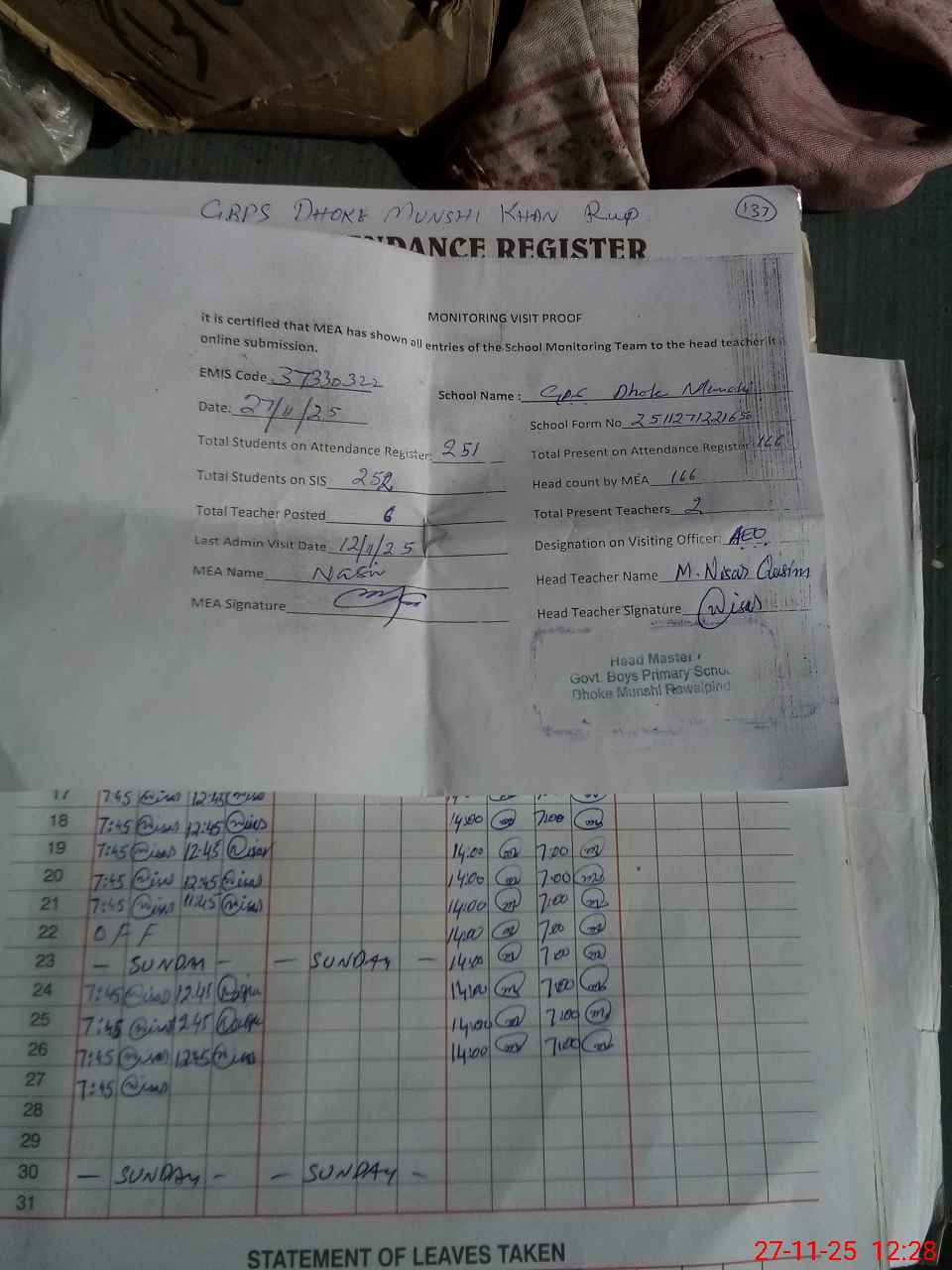 | Attendance Register | Head Teacher | MEA with School | Visit Proof |
