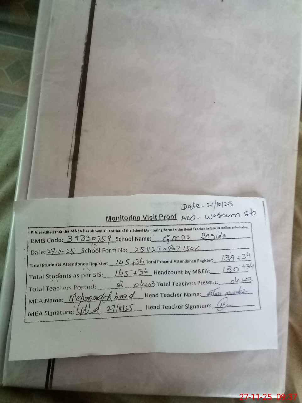 | Attendance Register | Head Teacher | MEA with School | Visit Proof |