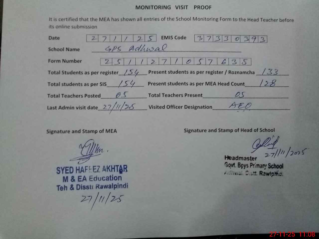 | EMIS Code: 37330393 | Name of School: GPS ADHAWAL | |||