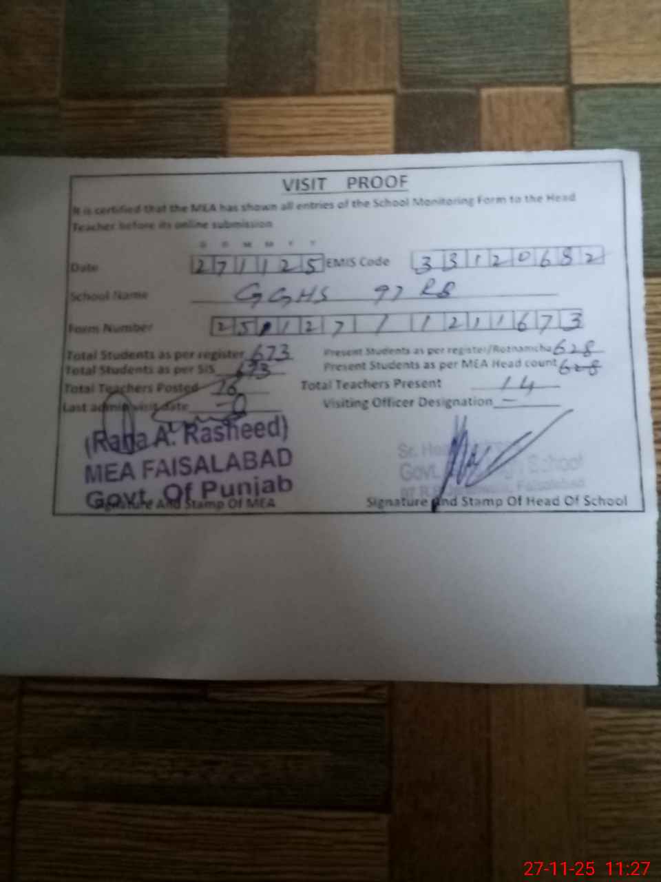 | Attendance Register | Head Teacher | MEA with School | Visit Proof |