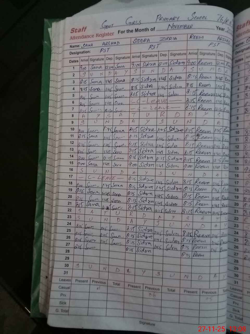 | CNIC | Full Name | Designation | R/C | Absence During Last Calender Month |