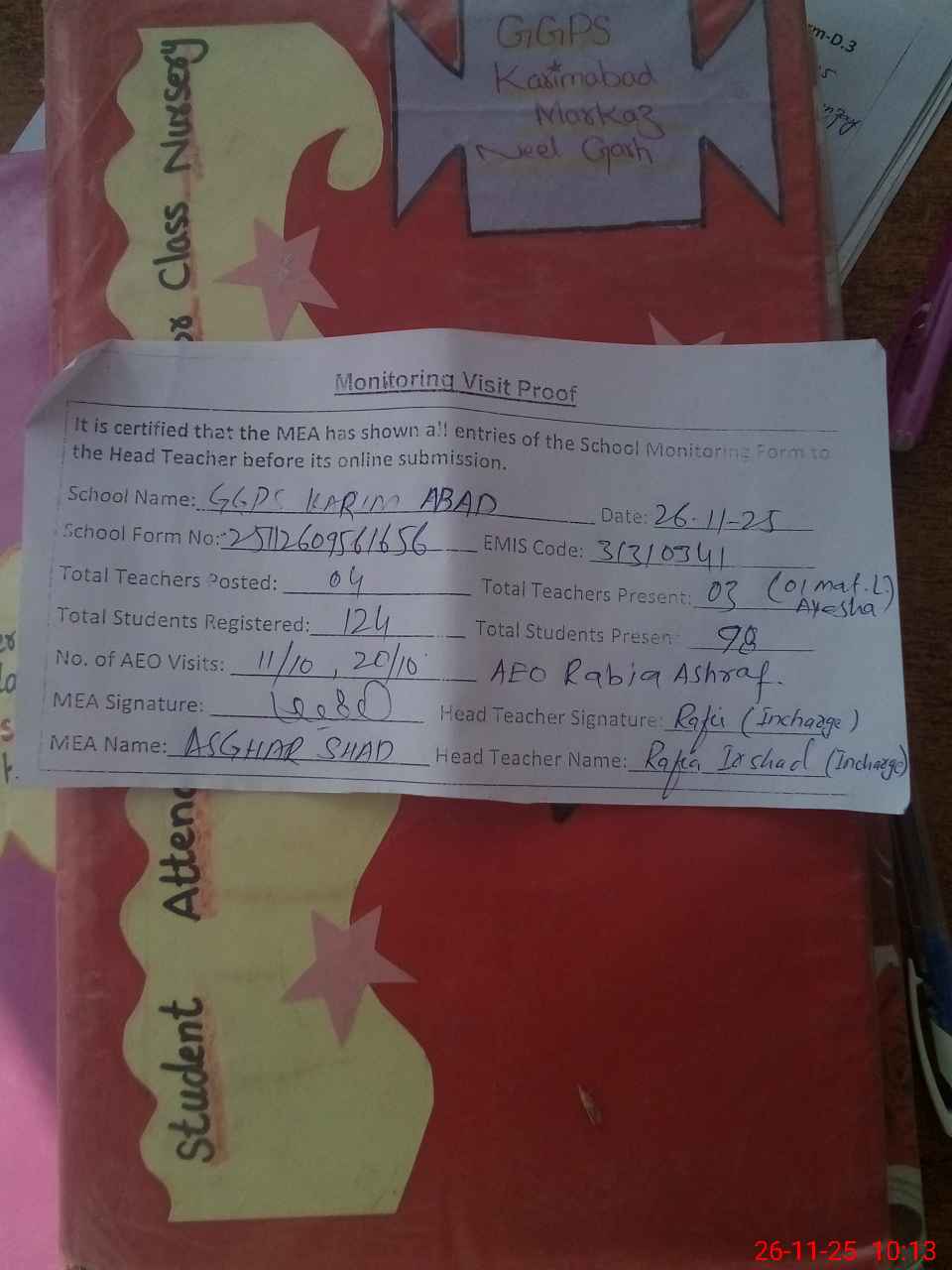 | Attendance Register | Head Teacher | MEA with School | Visit Proof |