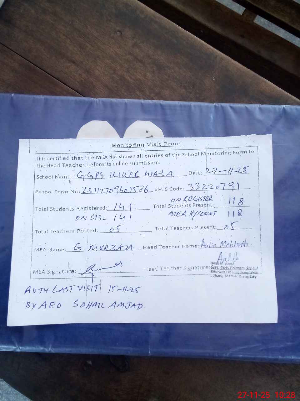| Attendance Register | Head Teacher | MEA with School | Visit Proof |