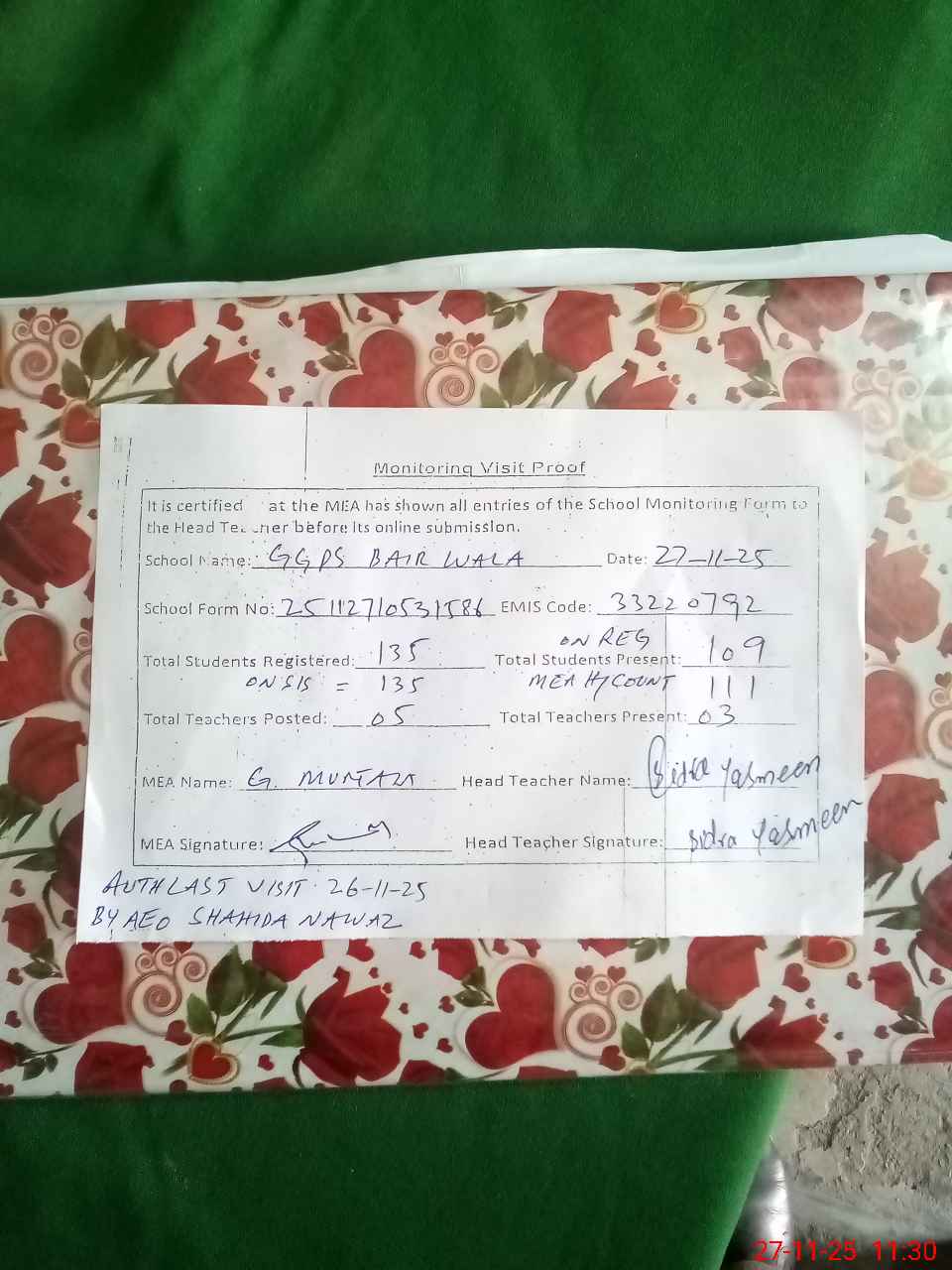 | EMIS Code: 33220792 | Name of School: GGPS BAIR WALA | |||