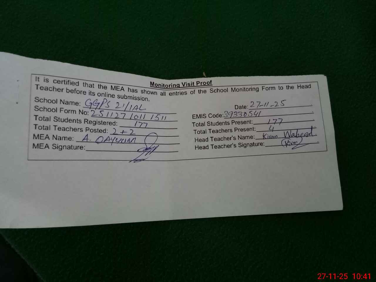 | Attendance Register | Head Teacher | MEA with School | Visit Proof |