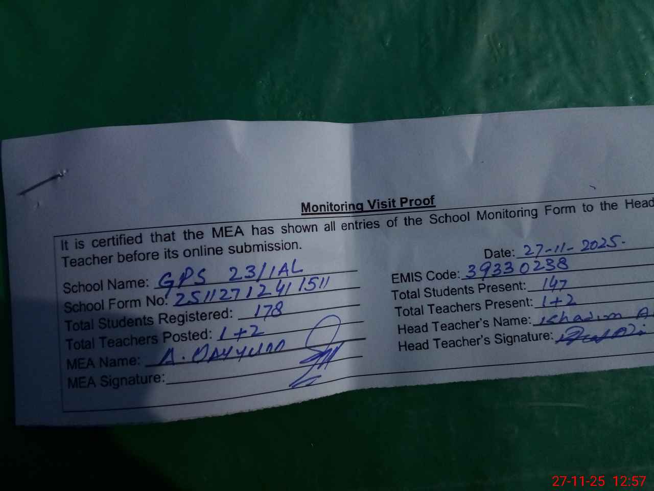 | EMIS Code: 39330238 | Name of School: GPS CHAK NO. 23/1-AL | |||