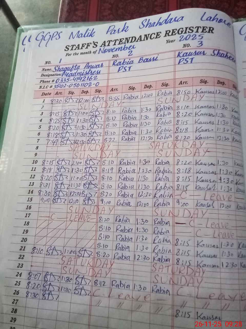 | CNIC | Full Name | Designation | R/C | Absence During Last Calender Month |