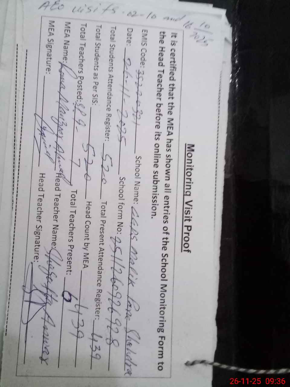 | Attendance Register | Head Teacher | MEA with School | Visit Proof |