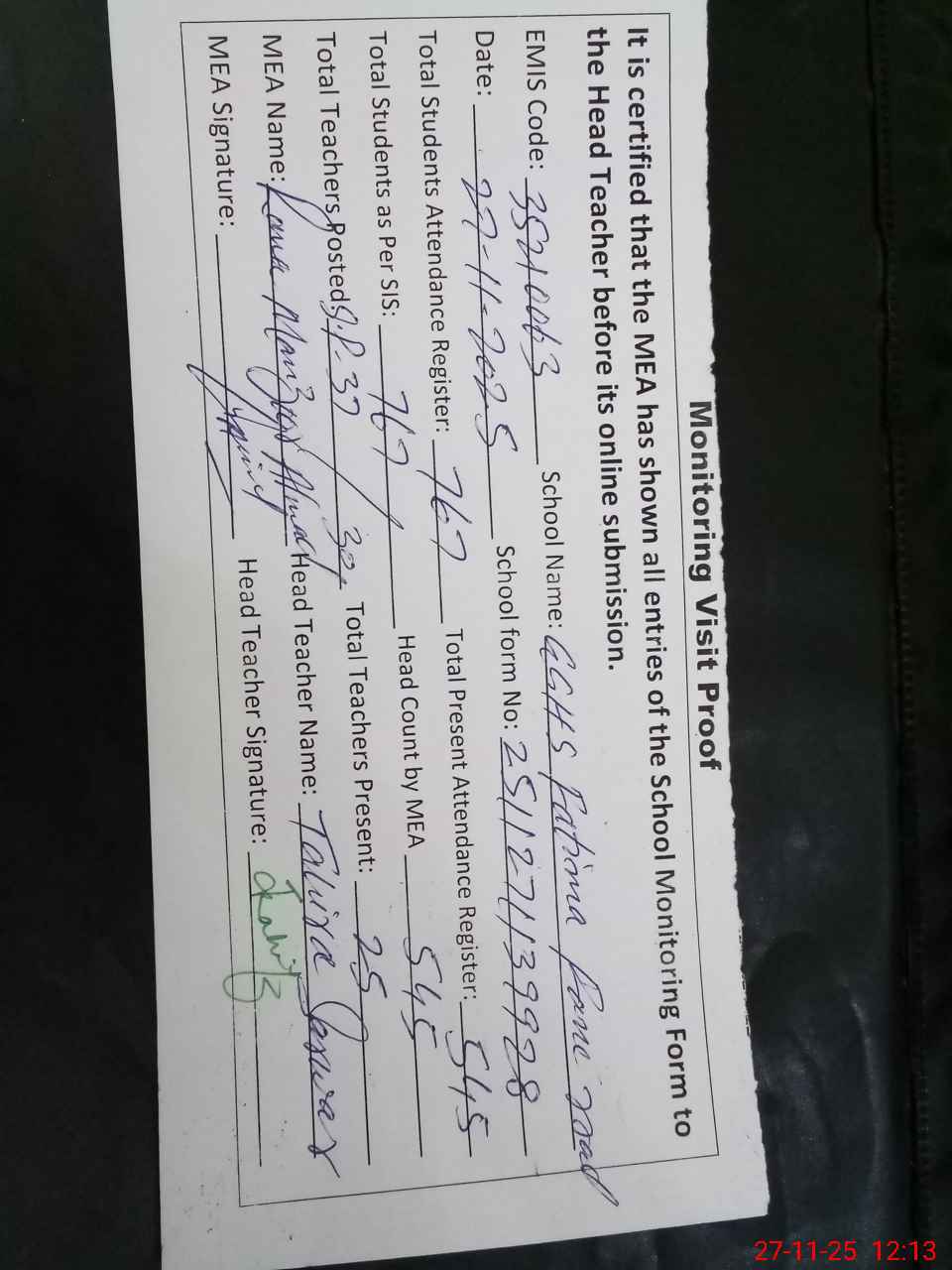 | Attendance Register | Head Teacher | MEA with School | Visit Proof |