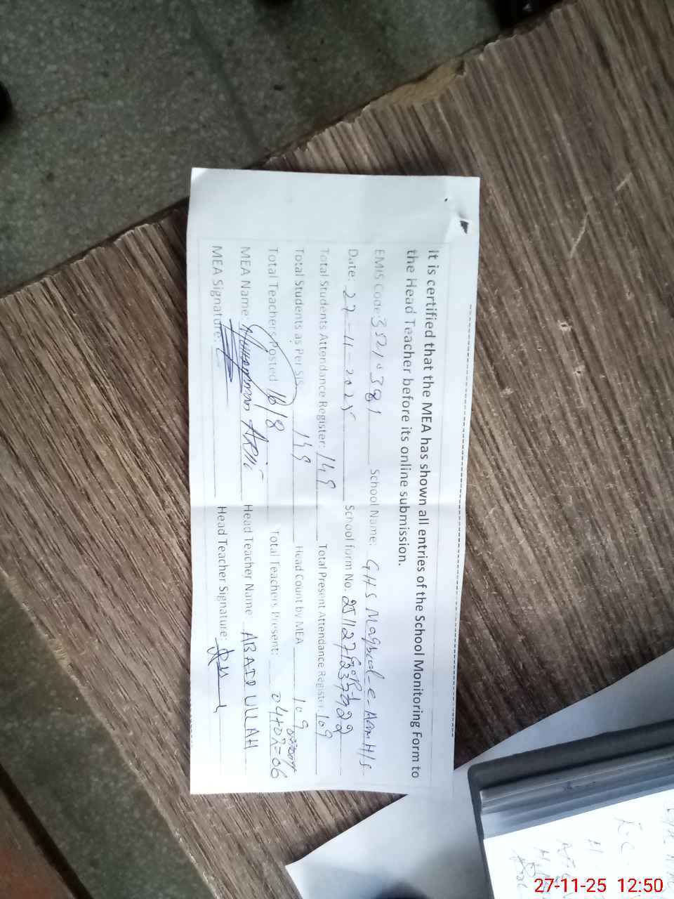 | Attendance Register | Head Teacher | MEA with School | Visit Proof |