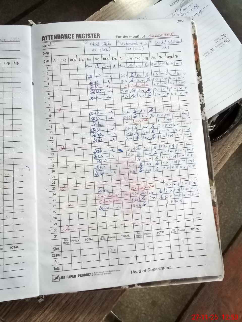 | CNIC | Full Name | Designation | R/C | Absence During Last Calender Month |