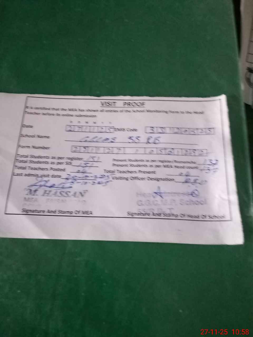| Attendance Register | Head Teacher | MEA with School | Visit Proof |