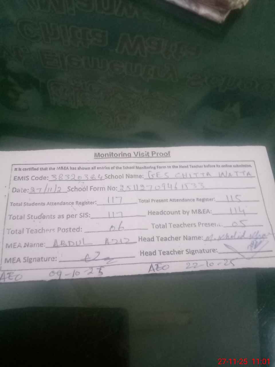 | Attendance Register | Head Teacher | MEA with School | Visit Proof |