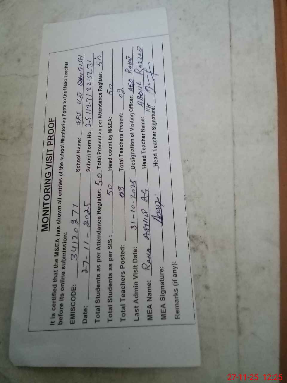 | Attendance Register | Head Teacher | MEA with School | Visit Proof |