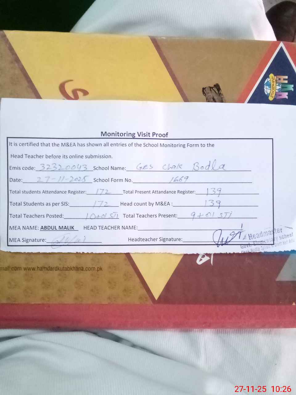 | EMIS Code: 32320043 | Name of School: GES CHAK BODLA | |||