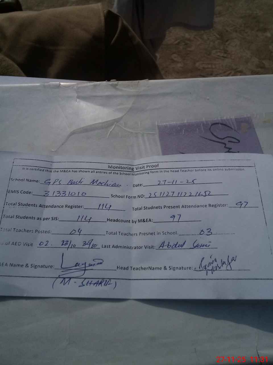 | Attendance Register | Head Teacher | MEA with School | Visit Proof |