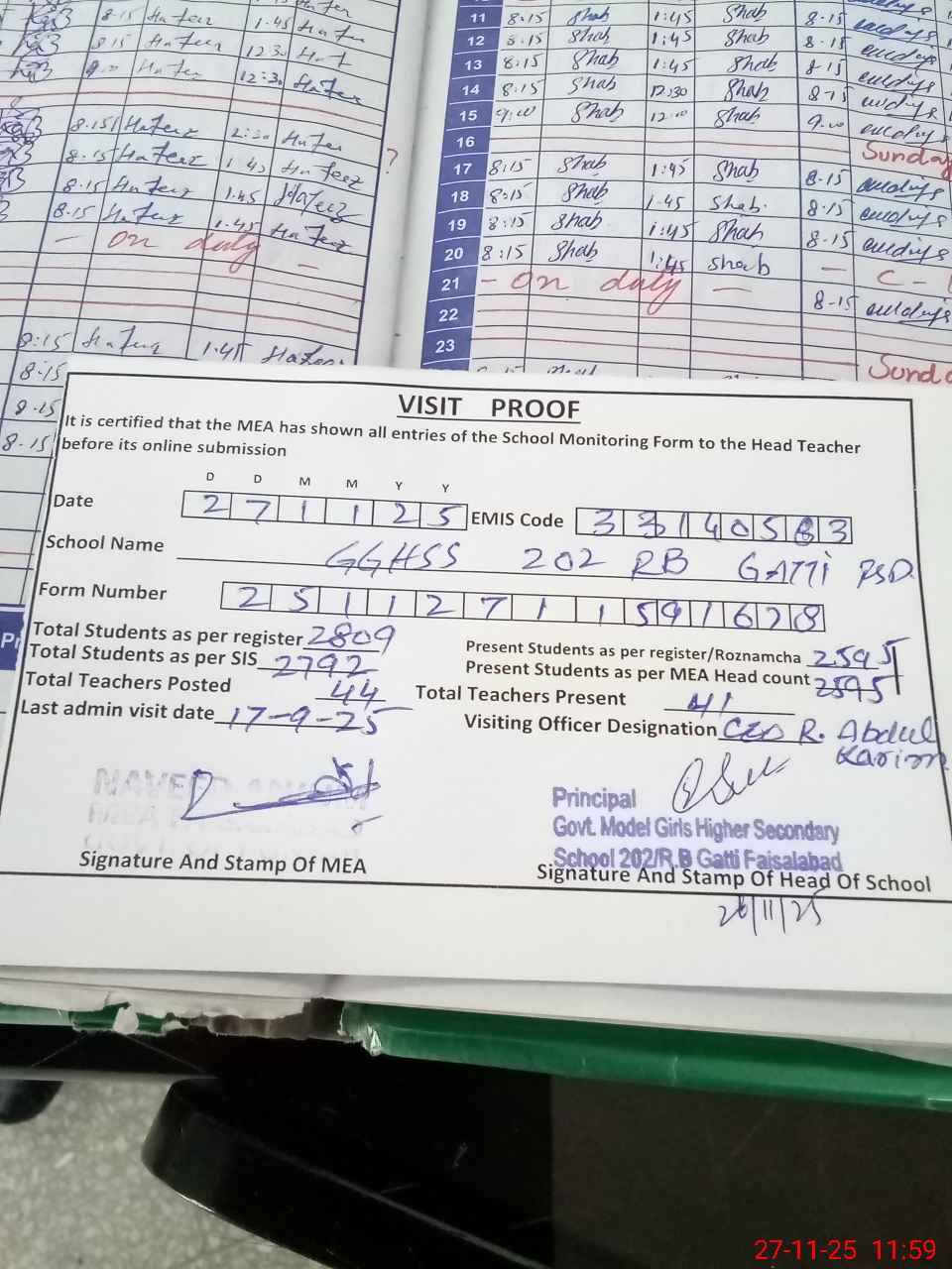 | Attendance Register | Head Teacher | MEA with School | Visit Proof |