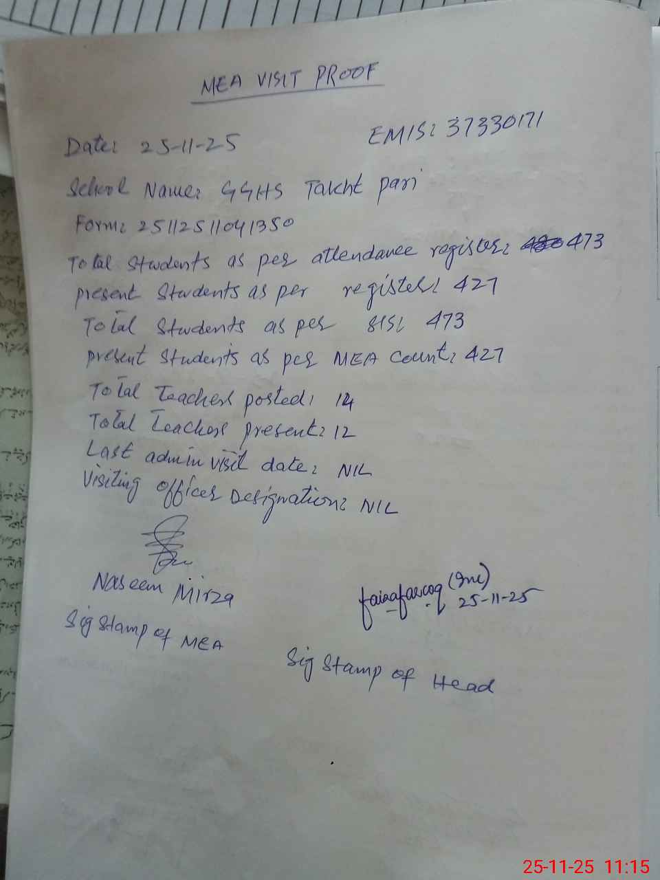 | Attendance Register | Head Teacher | MEA with School | Visit Proof |