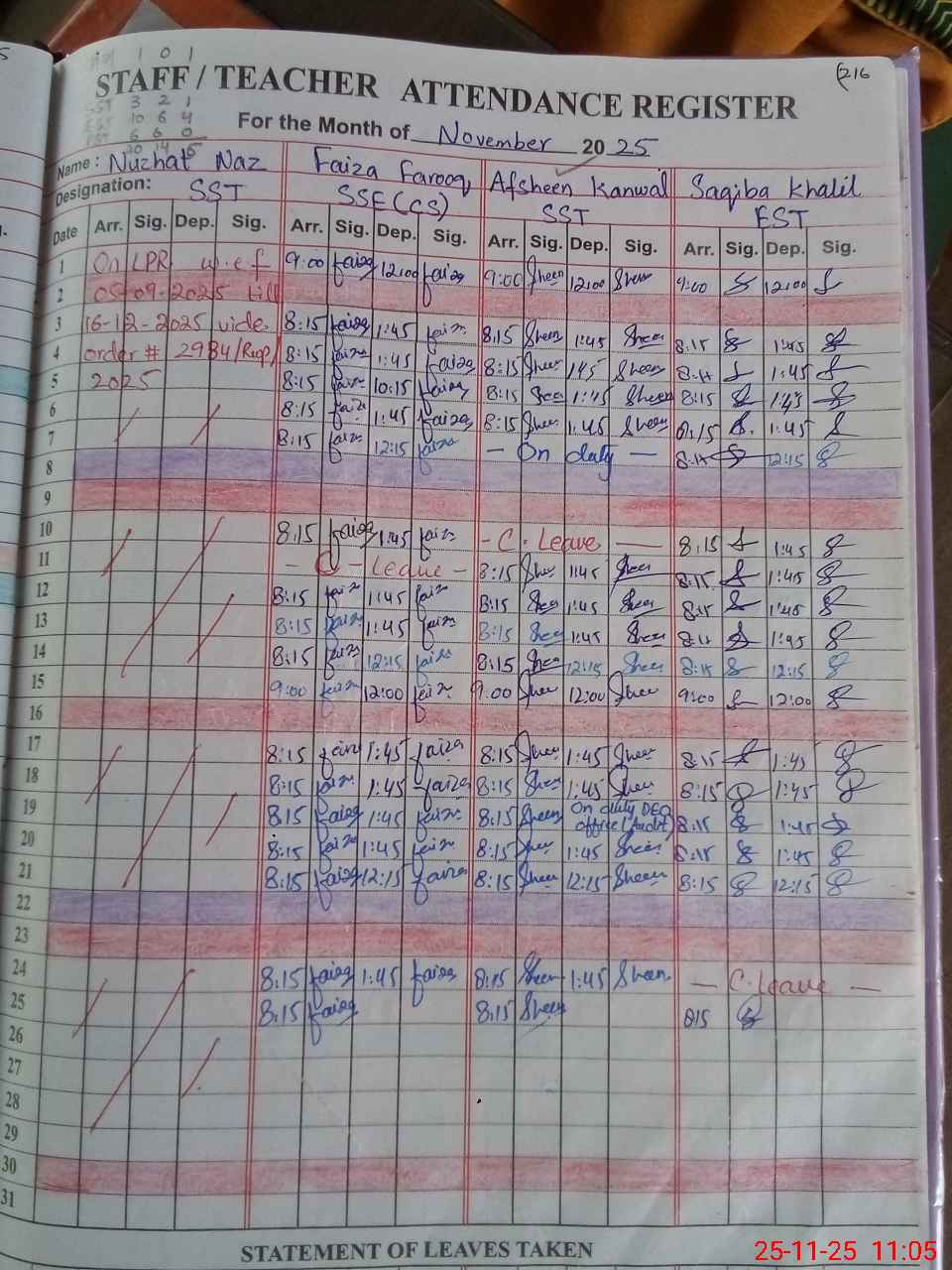 | 34**** | Sa**** Ka**** | EST | Regular | 0 | 0 | 0 | 0 | 0 | 0 | 0 | 0 | 0 | Exam Duty |