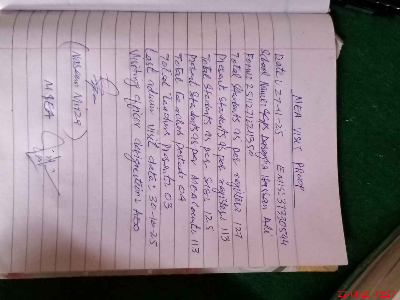 | Attendance Register | Head Teacher | MEA with School | Visit Proof |