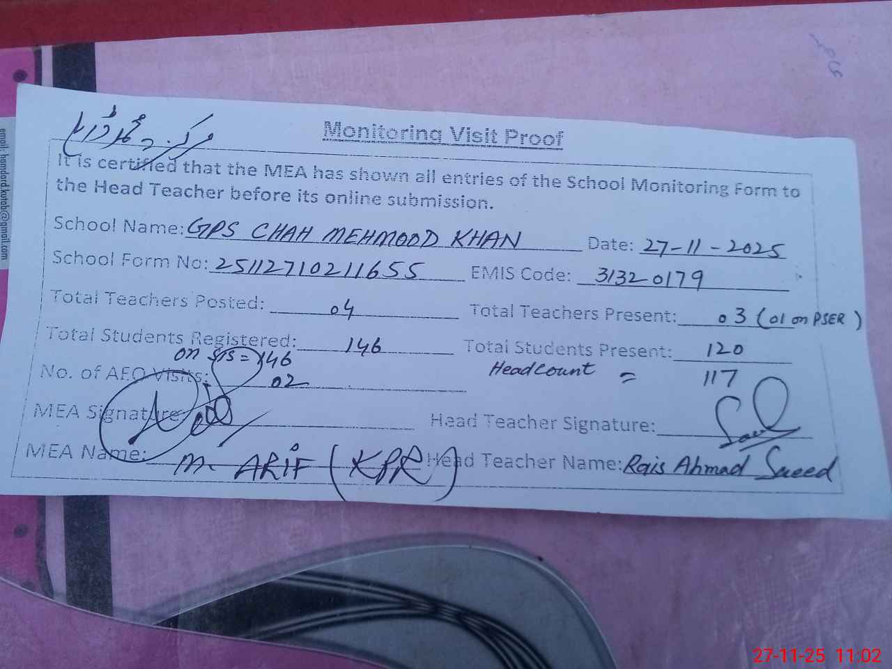 | Attendance Register | Head Teacher | MEA with School | Visit Proof |