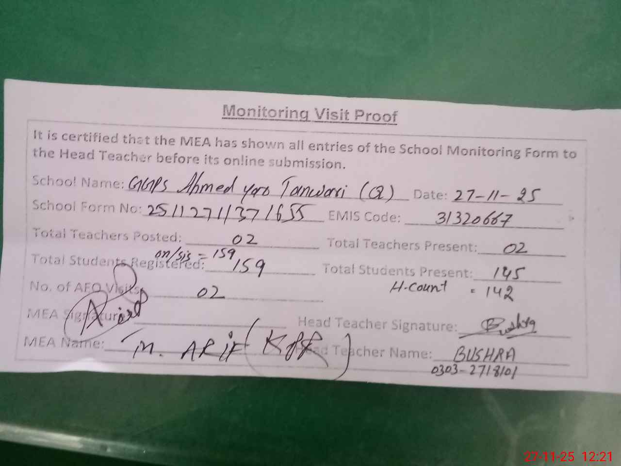 | EMIS Code: 31320667 | Name of School: GGPS AHMED YAR TANWARI QADEEM | |||