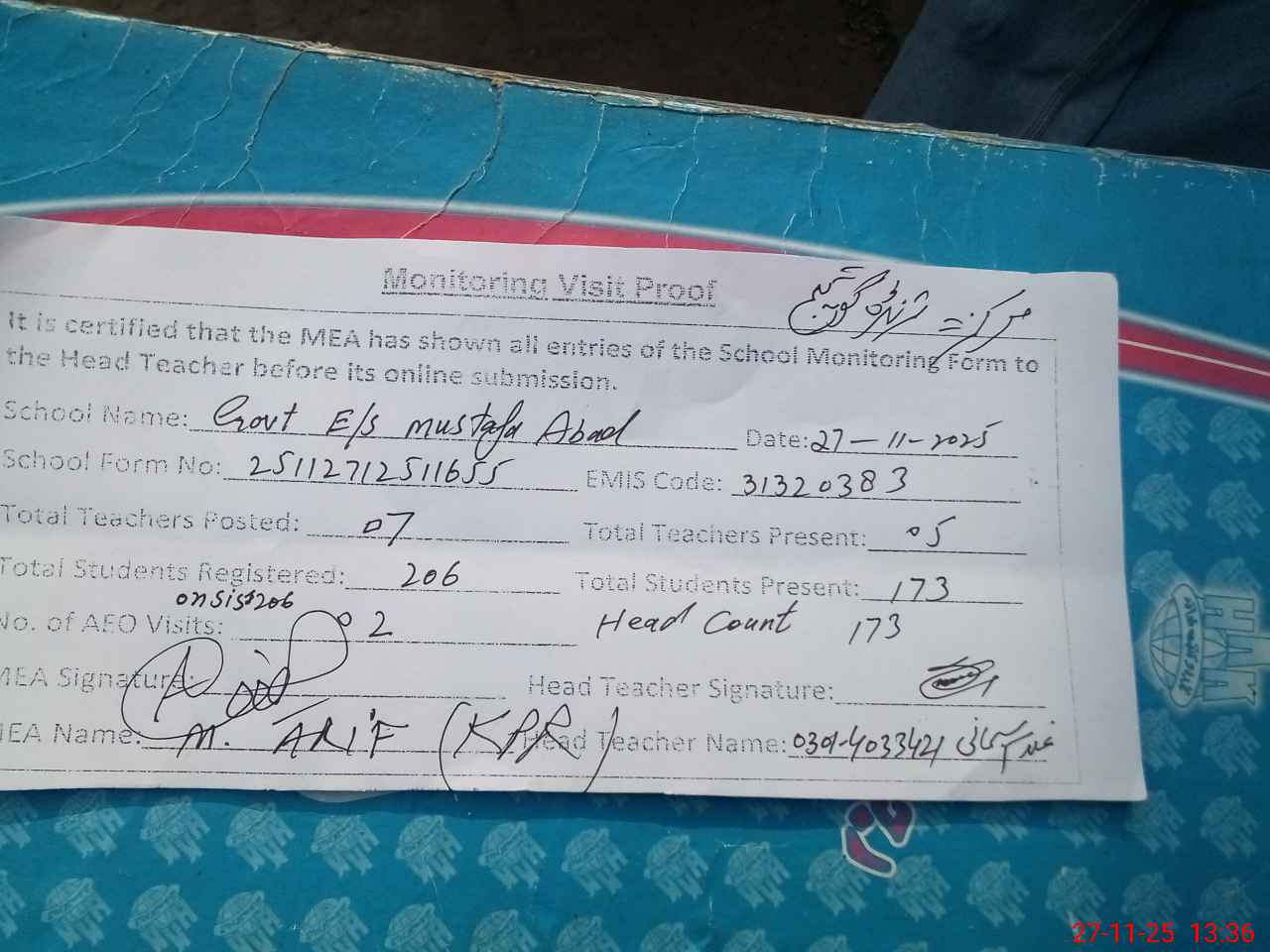 | Attendance Register | Head Teacher | MEA with School | Visit Proof |