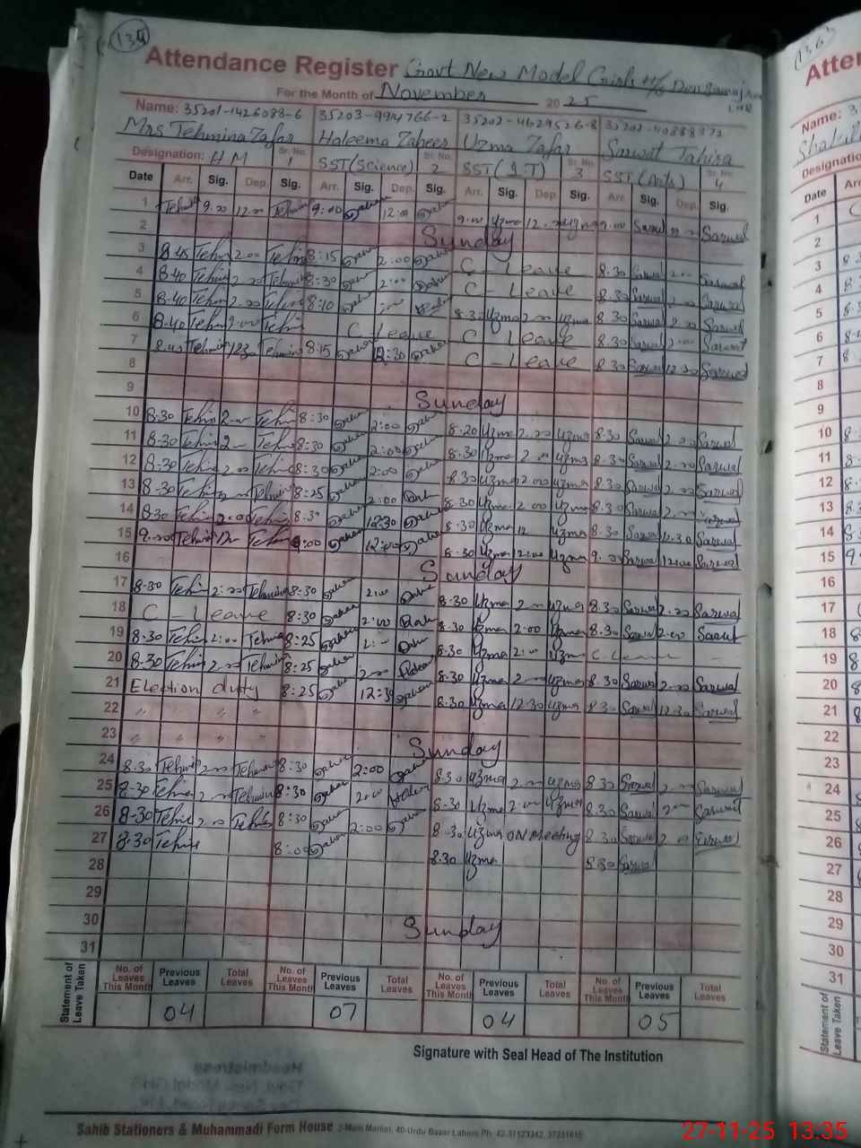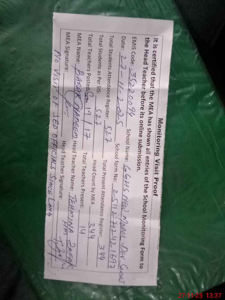 | Remarks (Use Separate Page if Required): Teacher Muqadas Naseer PST absent from duty since 23 October 2025 just after exipry of her meternity leave | |||||
