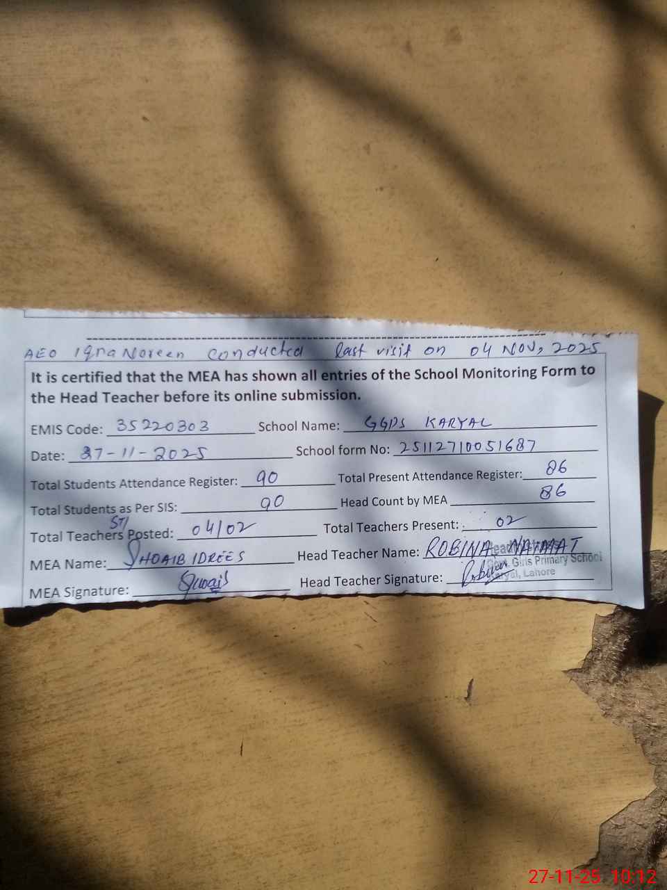 | EMIS Code: 35220303 | Name of School: GGPS KARYAL | |||