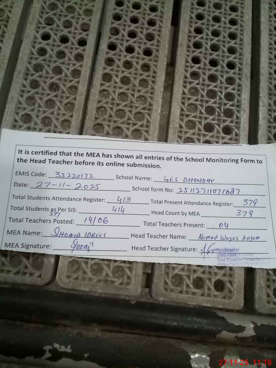 | Attendance Register | Head Teacher | MEA with School | Visit Proof |