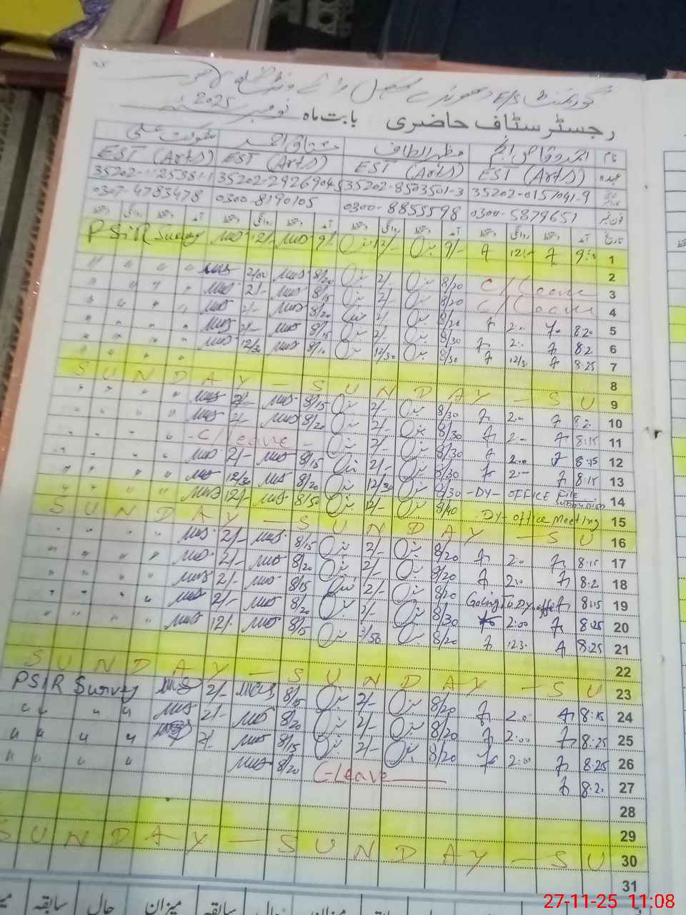 | CNIC | Full Name | Designation | R/C | Absence During Last Calender Month |