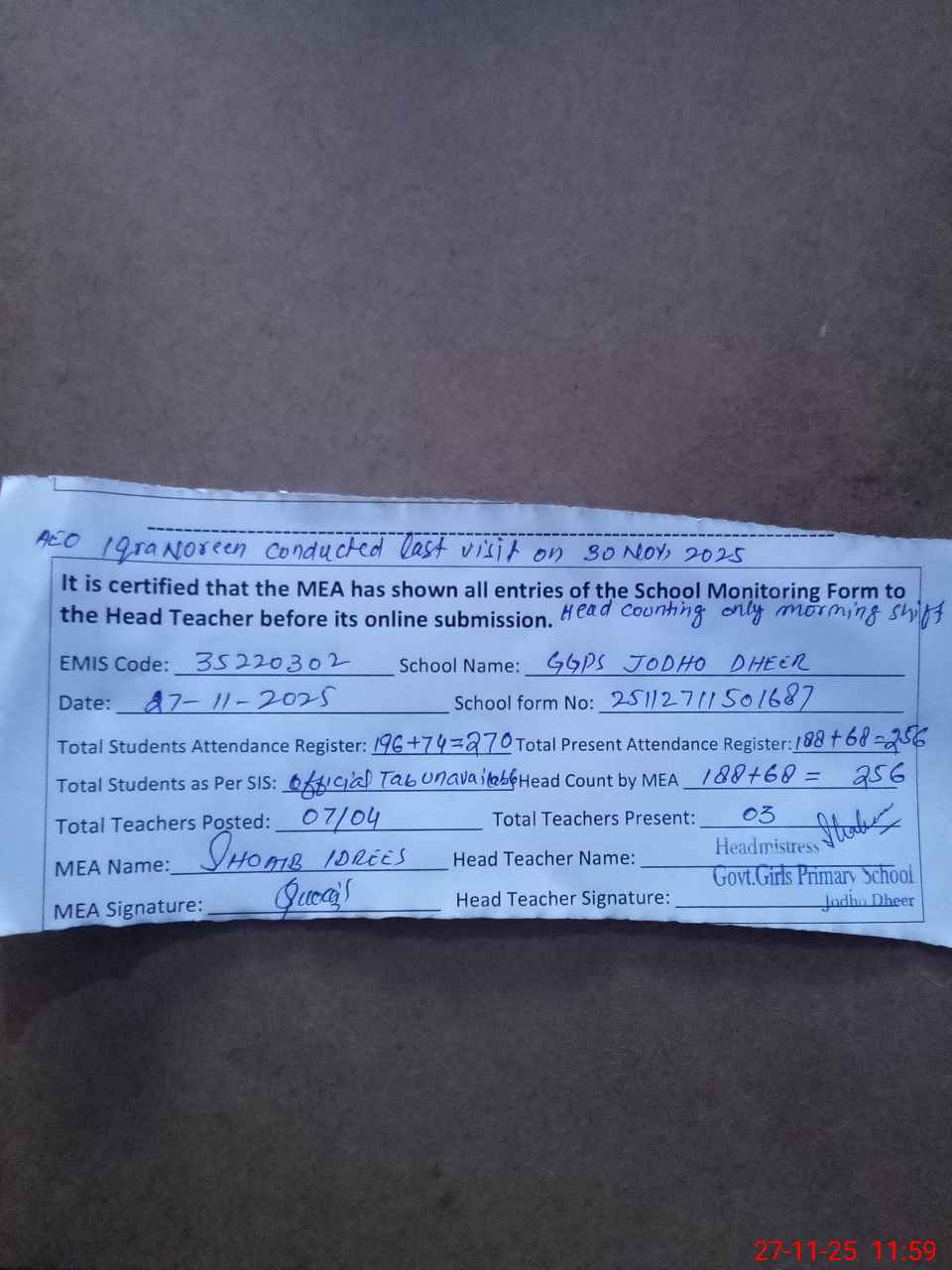 | EMIS Code: 35220302 | Name of School: GGPS JODHO DHEER | |||